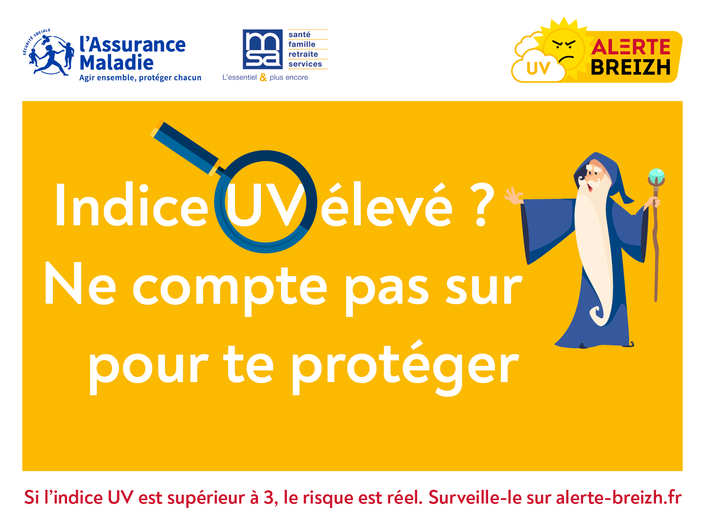 •S’informer de l’indice UV du jour : une protection est nécessaire dès l’indice UV > 3. Soyez vigilant même s’il ne fait pas chaud, en cas de vent frais ou si le temps est couvert car les UV ne chauffent pas ! Retrouvez l’indice de votre ville sur alerte-breizh.fr.