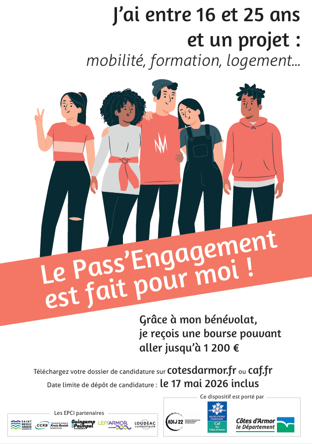 Dossier de candidature téléchargeable sur le site du Département première semaine de mars https://cotesdarmor.fr/pass-engagement ;