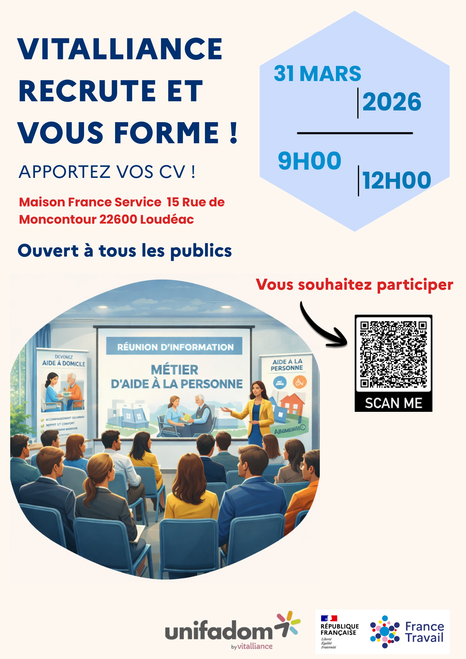 Une réunion d'information est organisée avec Vitalliance, une structure dédiée à l'aide à la personne avec un organisme de formation intégré, UNIFADOM à la Maison France Travail de Loudéac le mardi 31 mars à partir de 9H00 dans le cadre de la semaine Nationale du soin et de l'accompagnement.